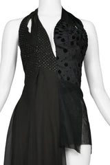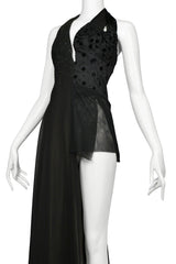Resurrection Vintage is excited to offer a vintage Maison Martin Margiela black asymmetrical evening gown featuring one covered leg, one short leg, a halter bodice, and contrasting fabrics.