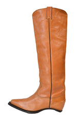 Resurrection Vintage is excited to offer a pair of Maison Martin Margiela brown leather heelless cowboy boots from the spring 2000 collection, featuring an interior hidden wedge heel, pointed toe, pull tabs, and below-the-knee length.