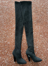 Resurrection Vintage is excited to offer a pair of Saint Laurent Paris black koller stretch cloque thigh-high sock boots featuring a python effect smocked detailing throughout, stretch fit, almond toe, stacked heel, and leather soles.