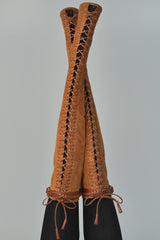 Resurrection Vintage is thrilled to offer a pair of vintage Pucci brown suede corset thigh-high boots with metal heels from the 2011 runway collection. These heels feature thigh- high lace up detailing, gold hardware, peep toes, leather wrap-around straps with buckles at knees, leather braided tassels, metal stiletto heel, and back zipper closure.
