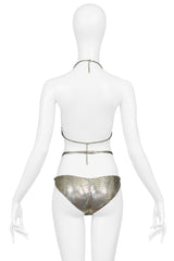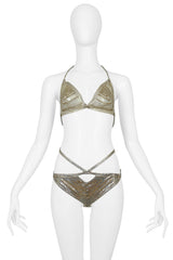 Resurrection Vintage is excited to present a vintage Paco Rabanne silver chainmail metal two-piece bikini with gold-tone metal detailing. The bikini features a chainmail triangle top with gold hoops and chain straps with a clasp closure at back. The bottoms feature an attached belly belt, peek-a-boo front, and silver and gold chevron design.