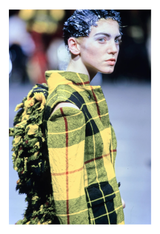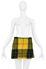 Resurrection Vintage is excited to present a Comme Des Garçons yellow ruffle tartan jacket and skirt suit ensemble from the 2000 FW collection. The jacket features the season's signature underarm cutouts, ruffled back, single-breasted closure, and two front pockets. The skirt features leather buckles at the waist, mini length, and a low waist.