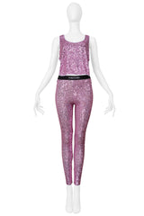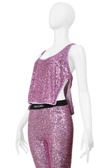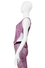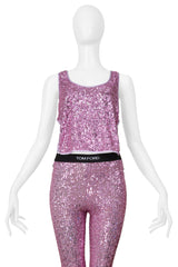 Resurrection Vintage is excited to present a Tom Ford pink sequin ensemble. The top features a racerback, sleeveless, a scoop neck, open side vents, and a cropped fit. The bottoms have a skinny fit, elasticized waistband, "Tom Ford" logo woven at the front of the waistband, and zippers at the ankles.
