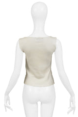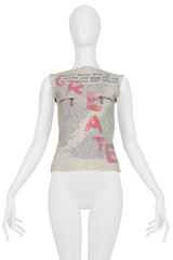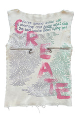 Resurrection Vintage is excited to offer an original and unusual example of a Vivienne Westwood & Malcolm McLaren SEX collection off-white cut-and-sew "square" t-shirt with zippers. The t-shirt features iconic "You're Gonna Wake Up One Morning And Know What Side Of The Bed You've Been Lying On..." multicolor text print and pink-red "Create" graphic conceptualized by the manager of The Clash and McLaren collaborator Bernie Rhodes. Each side of the shirt has a list. One features "good" things (Eddie Cochrane, Jamaican rude boys, Bamboo Records) and and the other "bad" things (television and Mick Jagger).