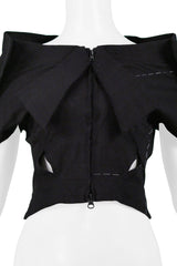 Resurrection is pleased to offer this vintage Yohji Yamamoto black cotton zip-up crop top featuring a wide neckline, short sleeves, raw edges, cut out panels at waist, and white basting stitching.