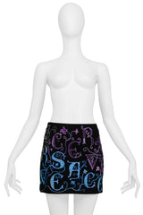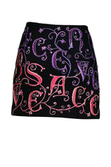 Resurrection Vintage is pleased to offer a rare vintage Versace Atelier black mini skirt with blue, purple, and coral embroidered Versace lettering.