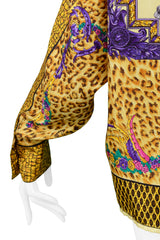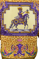 Resurrection is excited to offer a vintage Gianni Versace Couture silk oversized scarf blouse featuring a flap collar, decorative black, and gold Medusa buttons, front placket with hidden buttons, long sleeves, contrasting border print, and an all-over leopard print with a fancy baroque style horse rider with gladiator skirt and pink Versace logos on the front and back.