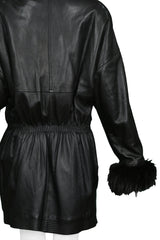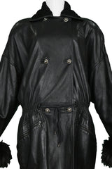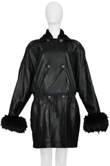 Resurrection Vintage is pleased to offer a rare vintage black leather double-breasted coat featuring a drawstring waist, fur cuffs and collar, slant pockets, and decorative silver-tone buttons.