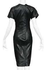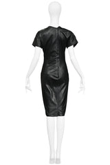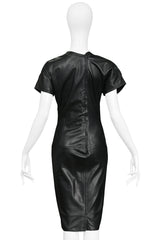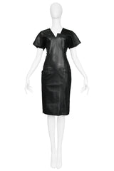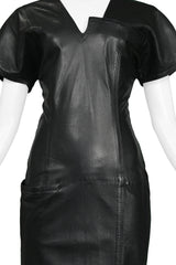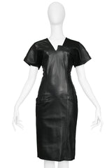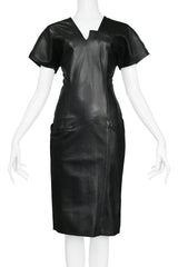 Resurrection Vintage is excited to offer Gianni Versace black leather day dress featuring an asymmetrical v neckline, short sleeves, slit pocket, back zipper, and fitted sexy silhouette.