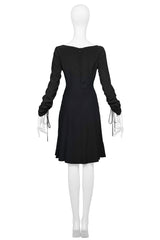 Resurrection Vintage is excited to offer a Versace black silk day dress featuring a v-neckline with drawstrings, long sleeves with drawstrings, back zipper, and easy sexy silhouette.