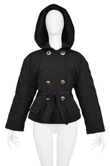 Resurrection Vintage is pleased to offer a vintage black nylon quilted jacket with a double-breasted front, gold and black buttons, removable hood, belt, and side pockets.