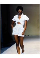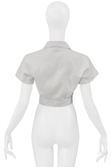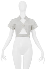 Resurrection Vintage is excited to offer an iconic vintage Azzedine Alaia white cotton crop top featuring short sleeves, pique texture, folded collar, cutout, and button closure.