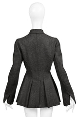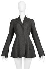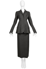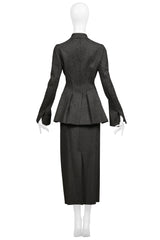 Resurrection Vintage is thrilled to present a stunning vintage ensemble from Alberta Ferretti. This set includes a fitted grey wool felt jacket with front flap pockets, slit cuffs, and a pleated back. The matching long straight skirt also features a center back slit.