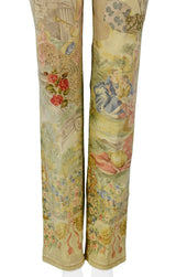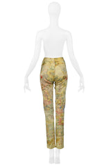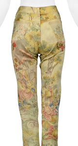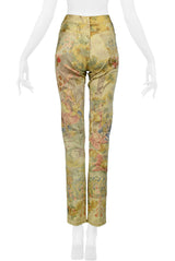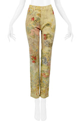 Resurrection is pleased to offer a pair of vintage Roberto Cavalli pale yellow denim high waisted pants with all-over Victorian-style floral and figure print with suede applique patches, center-front zipper with gold-tone hardware, and straight leg cut.