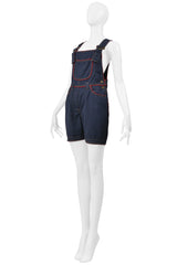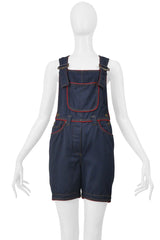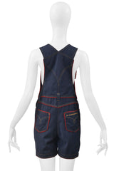 Resurrection Vintage is delighted to offer a vintage Moschino denim romper that features red piping, adjustable straps with metal buckles, five pockets, signature on back pocket, and an above-the-knee length fit.