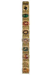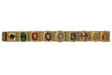 Resurrection Vintage is excited to offer a one-of-a-kind Richard Minadeo brass link bracelet. The bracelet features multicolor glass gemstones featuring Zodiac signs, decorative multicolor glass components, and gold studs set in gold-tone resin.