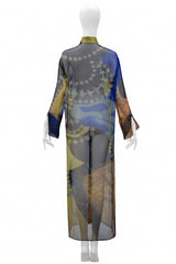Resurrection Vintage is excited to offer a vintage Gianfranco Ferre multicolor chiffon caftan shirt dress featuring decorative print, slit cuffs, button front placket, and folding collar.