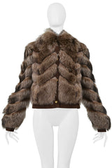 Resurrection Vintage is excited to offer a vintage Gucci brown chevron fur coat from the 2008 FW collection by Frida Giannini, featuring a stand collar, slit pockets, snap closures, leather trim, bomber style, and is waist length.