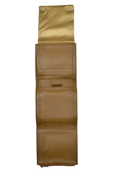 Resurrection Vintage is excited to offer a vintage Helmut Lang gold satin folding wallet featuring leather interior, credit card slits, snap closure, and coin pocket with zipper. Although the wallet has not been used it has faint leather discoloration on the interior panel, minor scuffing to the fabric.  Sold As-Is.