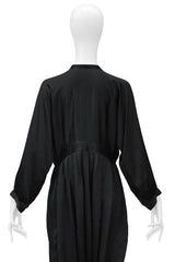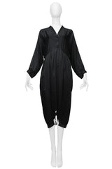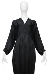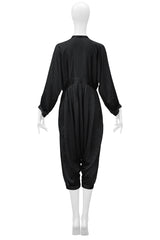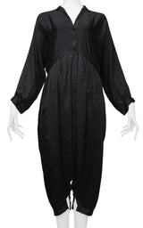 Resurrection is excited to offer a vintage Joan Vass black satin jumpsuit featuring, diamond pattern, button-up front, and drop crotch.