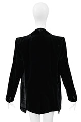 Resurrection Vintage is thrilled to offer a rare vintage Maison Martin Margiela black velvet jacket from the SS 2000 collection featuring iconic signature hidden pockets and details, shimmering liquid velvet fabric, exposed seams, raw edges, tailored body, buttons at the sleeves, a slim silhouette, and hip-length. Please see the studio and natural light photos below.