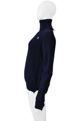 Resurrection Vintage is thrilled to present a vintage Maison Martin Margiela navy blue distressed high neck pullover sweater from the 2000 collection, featuring a rolled neck, decorative holes, ribbed knit, long sleeved, and hip length.