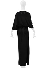 Resurrection Vintage is thrilled to offer a vintage Maison Martin Margiela black knit wrap dress from the 1999 collection, featuring short draped sleeves, tie strings to wrap the dress, a front pocket, and an ankle length design.