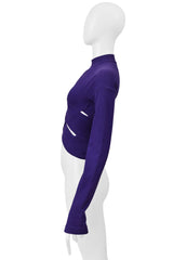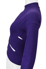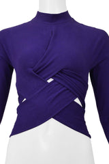 Resurrection Vintage is excited to present a vintage Romeo Gigli purple long sleeve cutout criss-cross top, featuring a mock neck, and cutouts at the front and back,