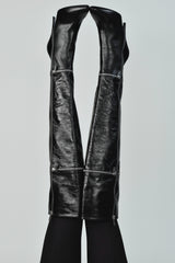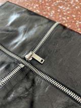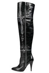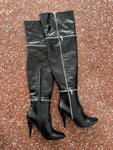 Resurrection Vintage is excited to offer a pair of black leather zipper boots by Saint Laurent Paris by Hedi Slimane. These boots feature decorative horizontal and vertical silver zippers, tapered heels, a patent leather look, and a knee-high fit.