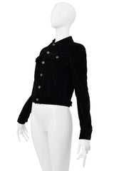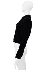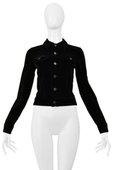 Resurrection Vintage is thrilled to present a Saint Laurent Paris by Hedi Slimane black velvet jacket featuring classic denim jacket details, slim fit, silver buttons, and rhinestone-studded musical notes on the back panel.