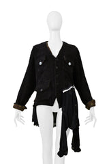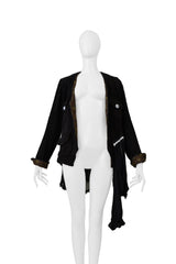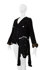 Resurrection Vintage is thrilled to offer a vintage Undercover black terry cloth jacket with eyeball buttons from the iconic 2005 "But beautiful" collection, where the grotesque and beauty coexist, featuring front button closures, deep neck, attached sheer ruffled fabric at side and back, four front pockets, and contrasting brown floral interior.