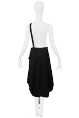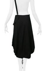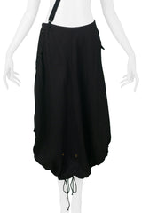 Resurrection Vintage is excited to present a vintage Yohji Yamamoto black oversized cargo skirt featuring an asymmetrical suspender, side buttons, grommets, and a drawstring hem.